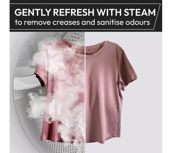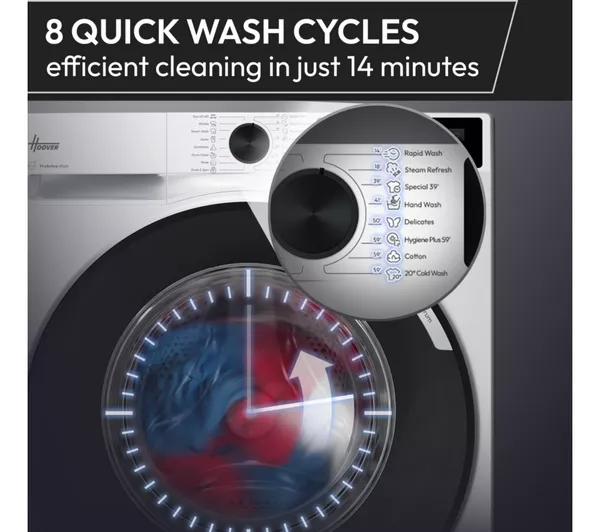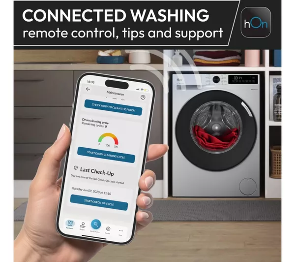 Choosing the right settings for your clothes can be tricky. This Hoover washing machine’s KG Mode Plus adjusts the cycle time, water and energy use based on the load size. Your clothes get the best treatment and it cuts down on waste. If you’re struggling with allergens, the Allergy Care Pro mode is on hand to help. It uses a rinse cycle and steam to remove up to 99.9% of germs and nasties. And the hOn app gives you access to over 60 dedicated cycles and sends notifications straight to your phone. Just connect it using WiFi and you’re good to go.